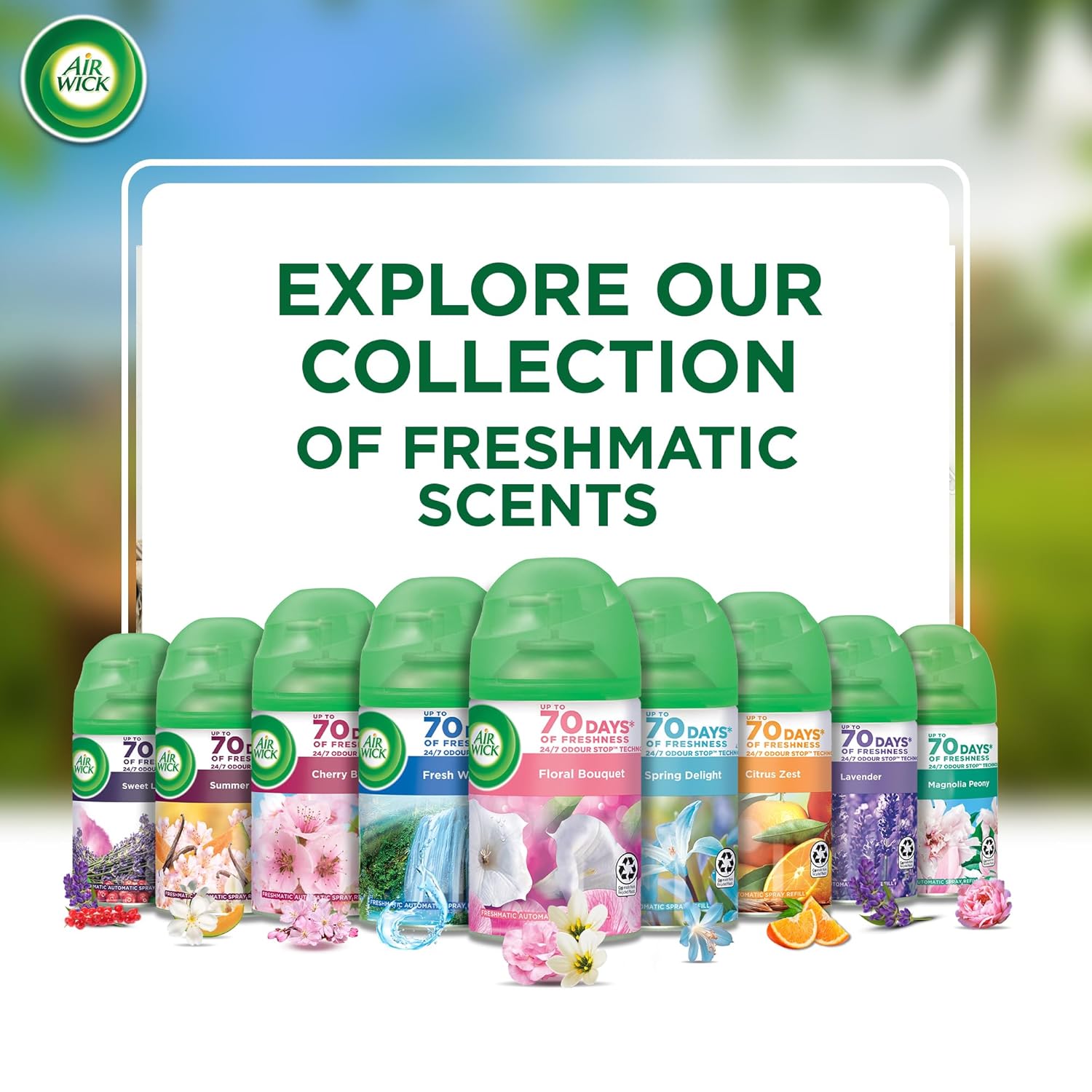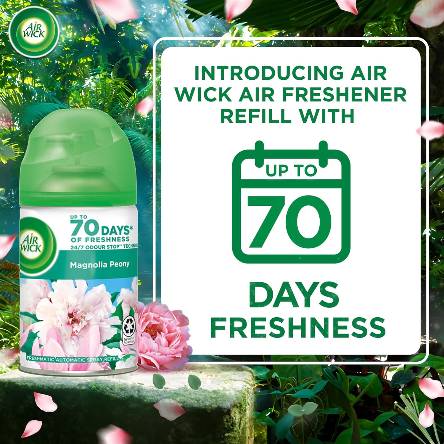 Experience continuous freshness in your home with Airwick Freshmatic Automatic Spray Refill Magnolia & Peony. This 250ml fragrance refill is designed for use with the Airwick Freshmatic Automatic Spray device, releasing delicate bursts of scent at regular intervals to keep your home smelling naturally fresh and inviting all day long.