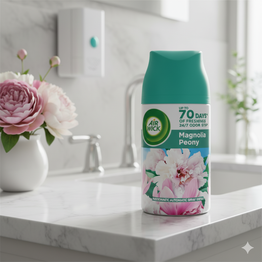Formulated with natural essential oils, Airwick Magnolia & Peony Refill delivers long-lasting fragrance that can last up to 60 days (based on low setting). It’s easy to install, safe to use, and compatible with all Airwick Freshmatic automatic devices. Bring nature-inspired freshness into your home effortlessly with every spray.