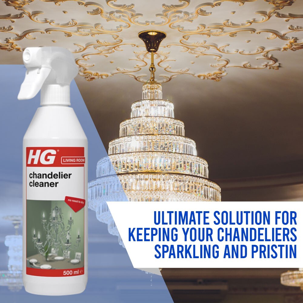 HG Chandelier Cleaner is a specialized spray cleaner designed to remove dirt, soot, and other deposits from chandeliers thoroughly and without streaks. It is suitable for use on glass, plastic, and crystal chandeliers and fittings, making light work of cleaning these delicate surfaces and producing a sparkling, streak-free result. This product dissolves dirt and deposits quickly, eliminating the need for scrubbing, which reduces the risk of damage to fragile chandelier components. Regular use helps prevent chandeliers from becoming heavily soiled, maintaining a sparkling and attractive appearance. It is also suitable for use on other glass and mirrors as a complement to a separate glass and mirror cleaner.
